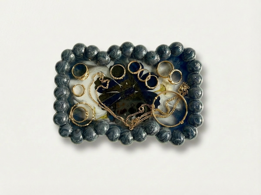 Beaded Edge Resin Jewelry Tray with Pressed Flowers - Black + Gold