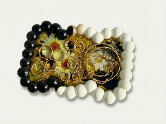 Beaded Edge Resin Jewelry Tray with Pressed Flowers - Black + White