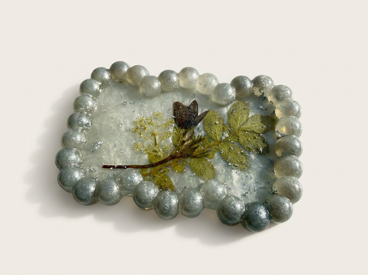 Beaded Edge Resin Jewelry Tray with Pressed Flowers - Silver